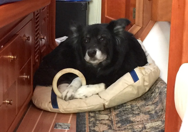 Sometimes my humans ask me to do things that are a little unusual. Like riding on a board on the water. Or jumping up really high or down really far to get onto the boat or into the dinghy. If I haven’t mentioned it before, I am very good at jumping, so….No Problem-O. But when we sail, I lay down next to one of my humans. The boat leans over to one side sometimes which I am not crazy about.